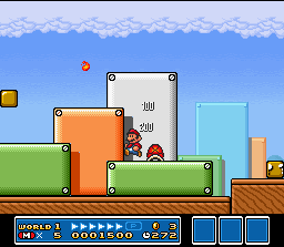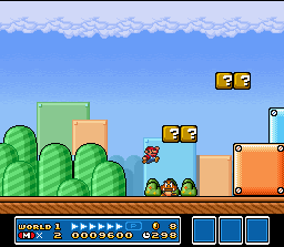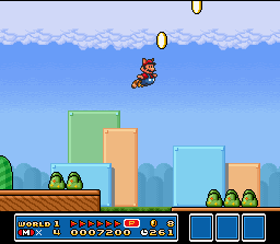 La disposizione di queste monete invita a un approccio diverso, poichè Mario non può raggiungere entrambe con un normale salto: il giocatore può però sfruttare il libero spiazzo che le precede per correre. La rincorsa, introdotta proprio nel terzo capitolo, si manifesta attraverso tre diversi feedback: una barra che si riempie, un’animazione dello sprite più veloce e un suono squillante, mostrando chiaramente che qualcosa di importante sta per accadere. Se Mario indossa la tuta tanooki, dopo la rincorsa e il salto si librerà in volo prendendo le monete e raggiungendo una fluttuante area nelle nuvole.